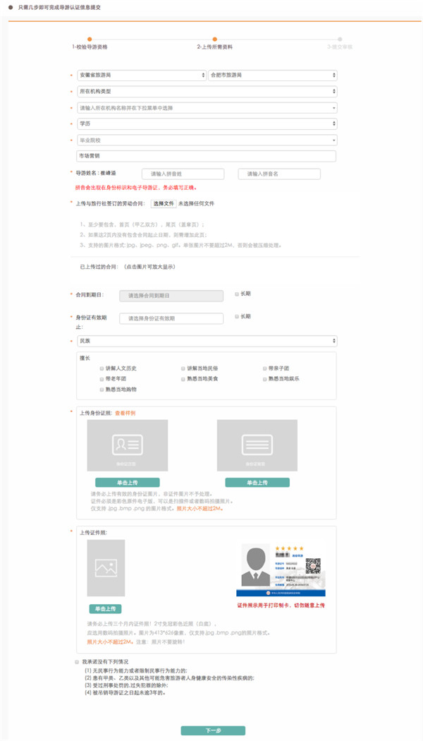 输入姓名、身份证号和导游资格证号进行提交。系统对输入内容进行校验,任一输入项校验不通过,系统都会给予错误提示。只有所有输入项都校验通过,系统会自动跳转到第二步