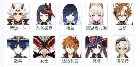 荒泷一斗、九条裟罗、夜兰、珊瑚宫心海、五郎