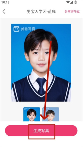 4、在模版详情页面,用户需要上传自己的正脸照片,点击生成写真即可完成证件照片的制作。