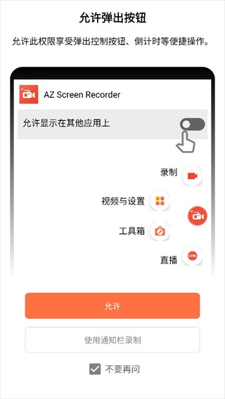 1、在本站下载安装AZScreenRecorder中文版app,打开软件需要先允许此权限享受弹出控制按钮、倒计时等便捷操作