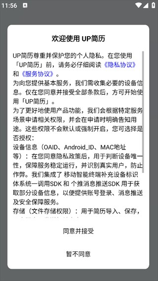 1、在本站下载安装up简历模版app并打开,点击‘同意并接受’,即可进入主页面;