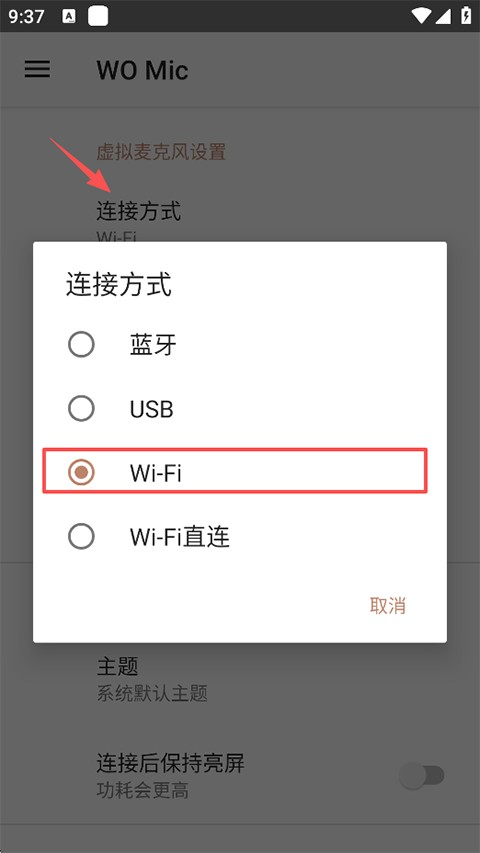 3、在设置界面中,找到并点击“连接方式”,然后选择“Wi-Fi”作为数据传输通道