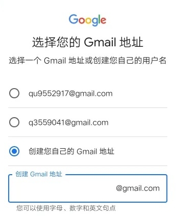 选择一个或创建一个账户。谷歌会随机给你生成两个账户,你可以选择谷歌给的,也可以自己创建一个地址。