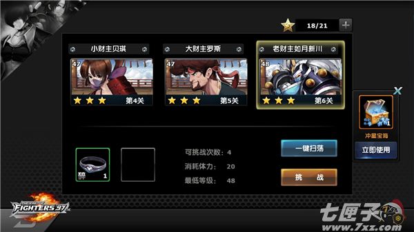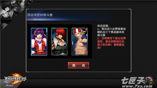 选择关卡后开始,系统会随机抽取三名格斗家,玩家在这三名格斗家中选择一个进入副本战斗,击杀最终boss为通关条件。