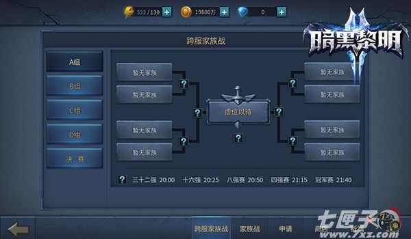 接下来说说玩法的事情吧。《暗黑黎明2》跨服战时间为每周日晚间20:00到21:20,每场比赛均设固定时长20分钟,参战的家族两两对战,胜者晋级、败者淘汰,最终决出唯一的冠军家族。如果单人参加,系统会为你自动匹配队友;如果两人组队,则由队长报名参与活动,注意只能是两人的队伍哦。